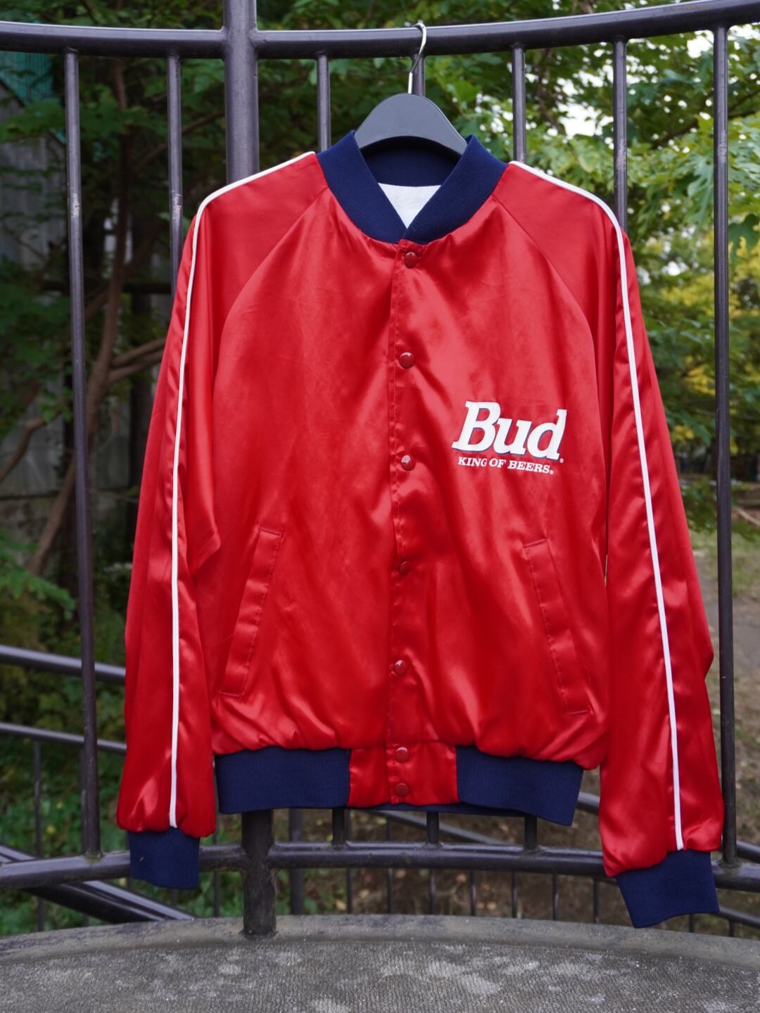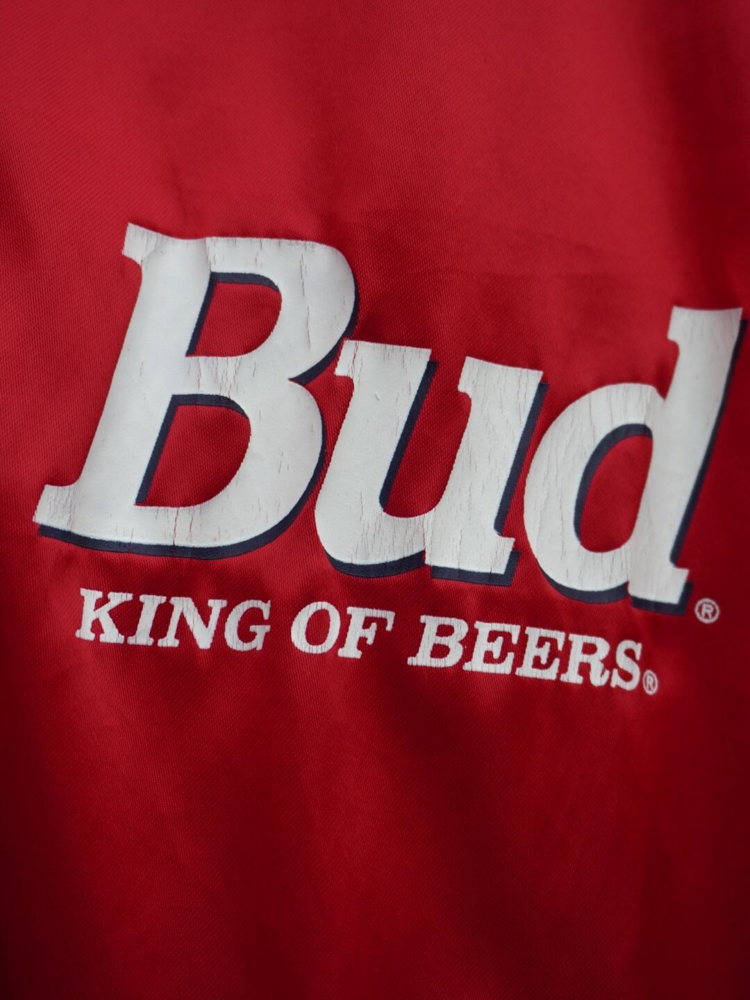 胸には “Bud. KING OF BEERS.”、背面には “Budweiser” のプリントが入り、企業アイテムらしい存在感のあるデザインが特徴。