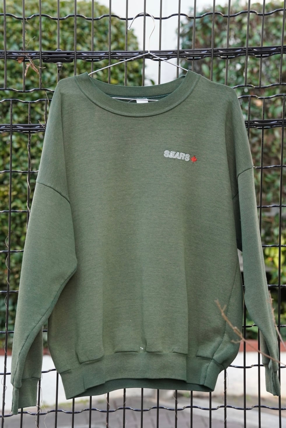 胸元の“SEARS” × メープルリーフ刺繍 が入るスウェット。おそらくカナダSEARSのカレッジ / ワーク系ラインに近いニュアンスだと。