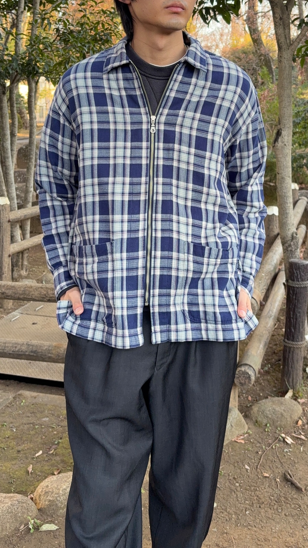いわゆる“シャツジャケット”ポジションのチェック柄ジップアップジャケット